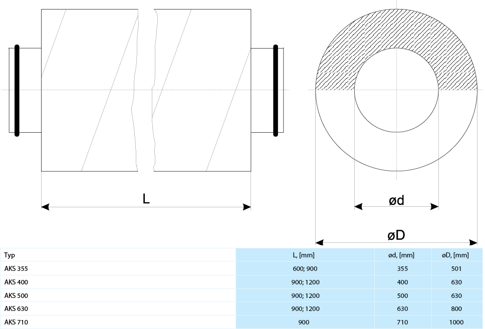 AKS je řada kulatých tlumičů hluku pro ventilační systémy. Pro vyšší útlum zvuku lze do kruhového potrubního systému instalovat více tlumičů.