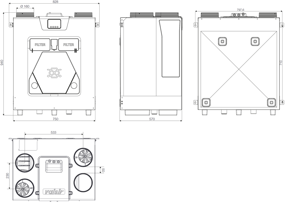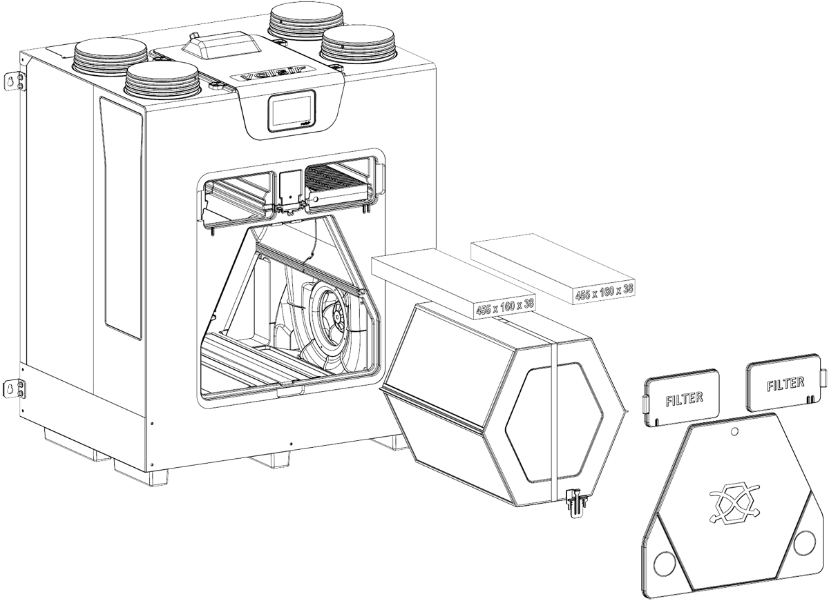 Plattenförmige Kunststofffilter mit der Abluftklasse ISO Grob >65 % (ehemals G4) und der Zuluftklasse ISO ePM1 >50 % (ehemals F7) sorgen für optimale Luftqualität. Die Filter lassen sich über separate Klappen mit ergonomischen Griffen entnehmen.