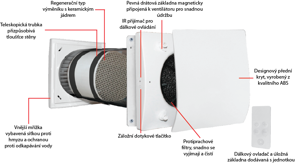 Decentralizovaný mechanický ventilační systém s napájením ze sítě a rekuperací tepla (systém push-pull), dostupný v rozměrech Ø100mm a Ø150mm: extrémně nízká spotřeba energie.