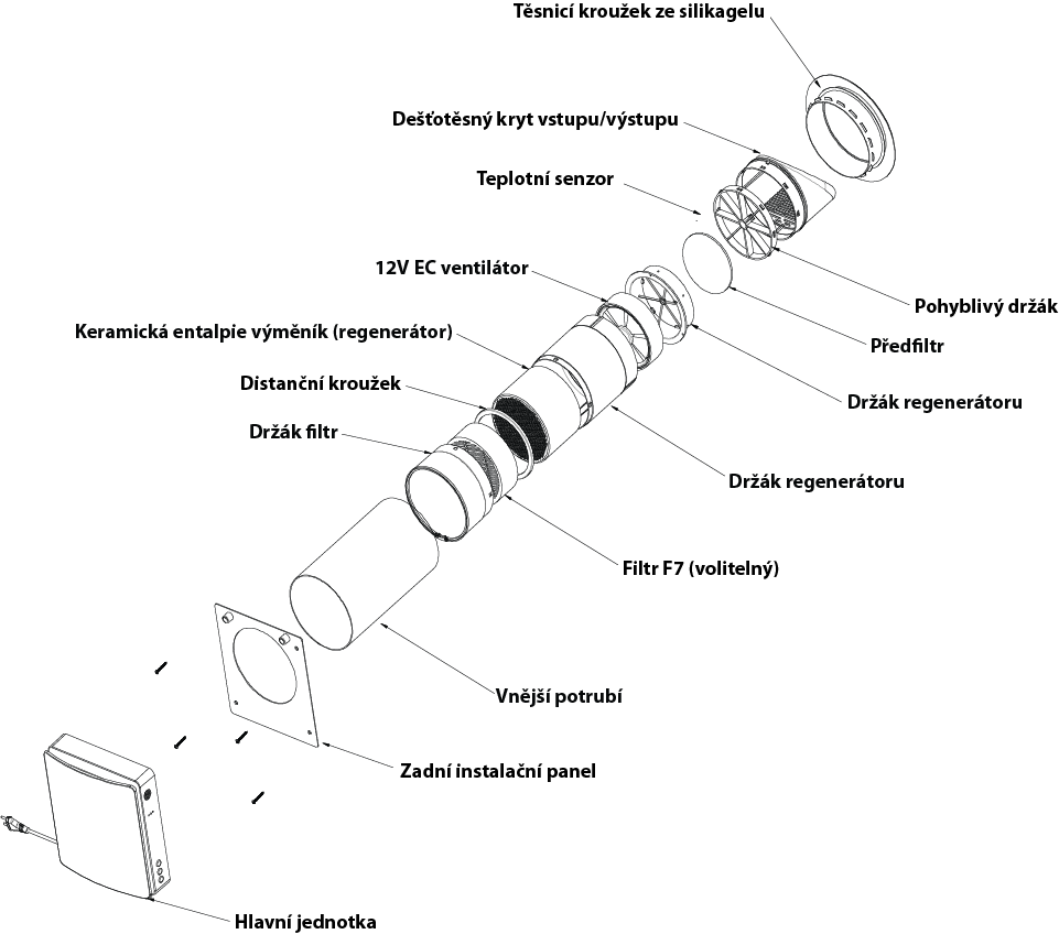 Ventilátor WALLER s rekuperací tepla pro jednu místnost je moderní zařízení pro obytné i komerční prostory, kde nejsou vhodné běžné systémy rekuperace tepla. Kombinuje funkce přívodu a odvodu vzduchu a zajišťuje tak efektivní výměnu vzduchu s rekuperací tepla a vlhkosti.