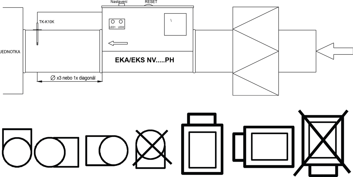 Minimální rychlost vzduchu: potrubní topná tělesa jsou navržena pro minimální rychlost vzduchu 1,5 m/s a maximální provozní teplotu výstupního vzduchu 50°C.