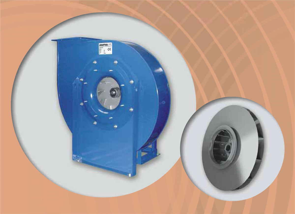 Průmyslové radiální ventilátory - 300 ÷ 45.000 m³/h, 750 ÷ 25.000 Pa celkem, radiální, vysokotlaký, dozadu zahnuté lopatky.