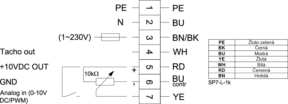 Rychlost motorů EC může být měněna při potenciometru 10 kOhm v řídicím obvodu. Tento způsob připojení k elektrické síti umožňuje vyhnout se nutnosti drahých a velkých regulátorů. Kromě toho může být rychlost měněna externím signálem 0-10 VDC nebo 10 VDC PWM.