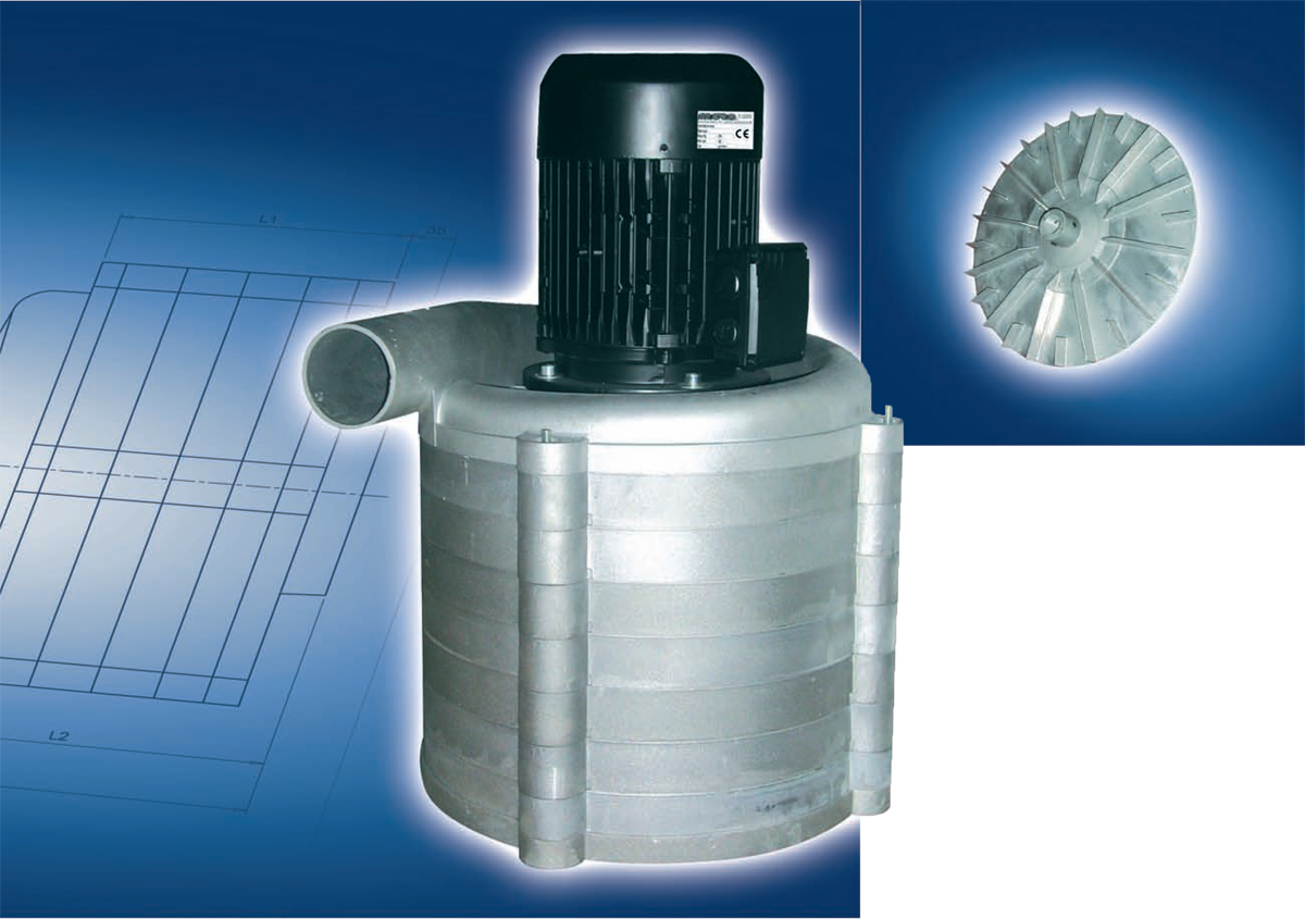 Průmyslové radiální ventilátory - 100 ÷ 800 m³/h, 1200 ÷ 17.500 Pa celkem, radiální, vysokotlaký, otevřená radiální lopatky pro pneumatický transport.