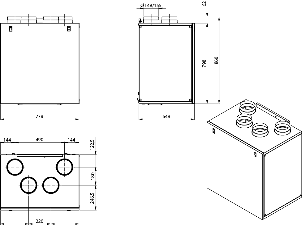 Centrální rekuperační jednotka vhodná pro vertikální instalaci na stěnu.