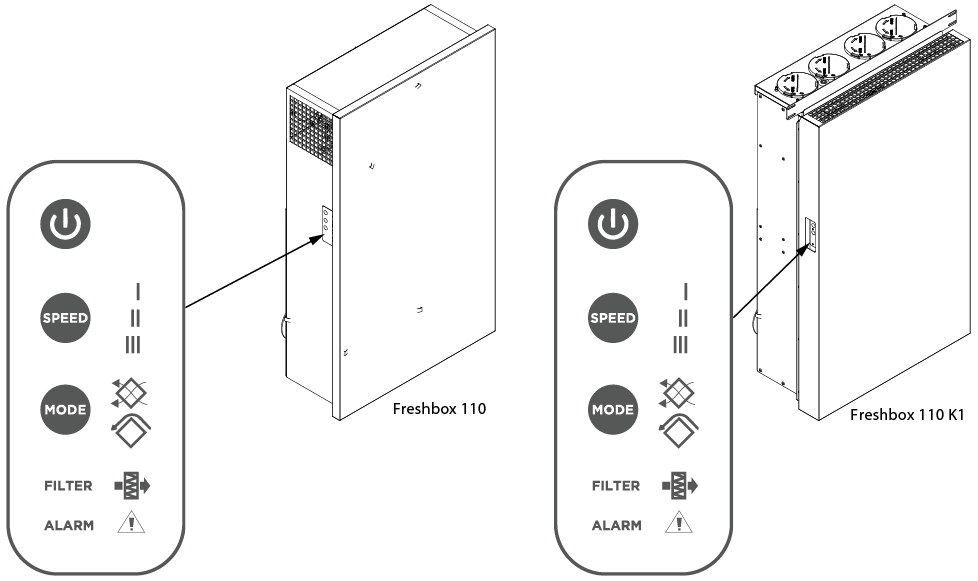 Freshbox 100 WiFi, Freshbox E-100 WiFi: Přiváděný vzduch je čištěn filtry G4 a F8. Pro splnění vyšších požadavků na čistotu vzduchu lze filtr F8 nahradit uhlíkovým filtrem H13 nebo F8 (prodává se samostatně). Odváděný vzduch je čištěn filtrem G4.