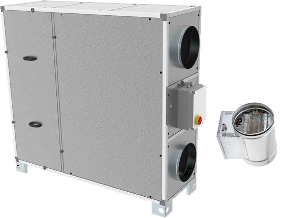 DUO-ED 2 BP EVO-PH RELM YVRekuperační jednotka - potrubní elektrický dohřev, izolace, potrubní, IP20, protiproudý výměník, nastavitelný hrdlem, filtr Průtok: 815 m³/h