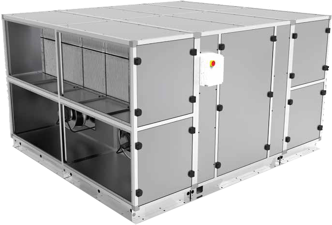Rekuperační jednotky ležatá - do 24.300 m³/h, do 113,8 kW topení, do 131,9 kW chlazení, tepelný obtok, EC motor, potrubní, filtr, CAV, protiproudý výměník, proměnnými ot..